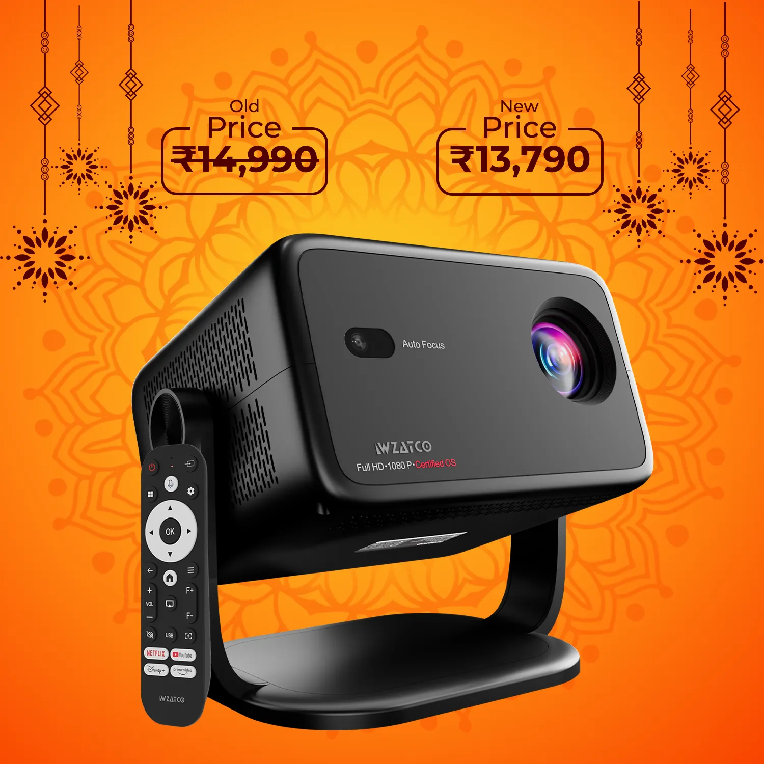 Experience stunning clarity with the WZATCO Yuva Vibe Projector, featuring Native 1080P resolution, 4K HDR support, and 14,000 lumens brightness. Enjoy fully automatic setup, built-in OTT apps, WiFi 6, Bluetooth, voice assistant, and ChatGPT integration - all in a sleek, 270° rotatable design.